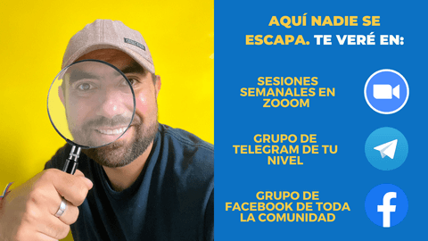 Me vas a tener SEMANALMENTE (De acuerdo a TU NIVEL) con sesiones de mínimo 1 hora y Media en ZOOM contigo y los demás alumnos en sesiones tipo MENTORÍA (nada de paja en los contenidos) para validar que TODOS Apliquen el paso a paso y me aseguraré que quienes participen logren el objetivo de CADA NIVEL.